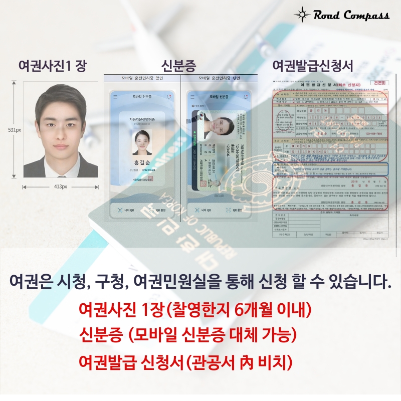 ; 여권용 사진 1매(6개월 이내 촬영한 사진), 신분증, 여권발급신청서